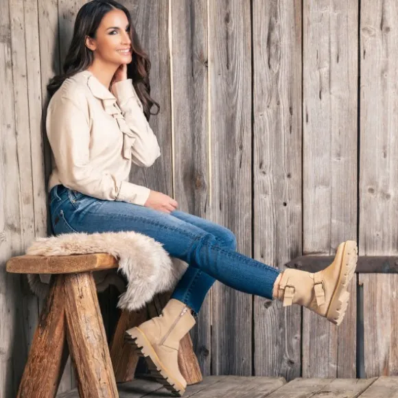 Hol dir den angesagten Biker-Look mit dem „Palado Dhitha“ aus der Palado by Sila Sahin Kollektion! Das hochwertige Rindsleder-Obermaterial verleiht dem Boot eine coole, robuste Optik, die durch die markanten Schnallen perfekt unterstrichen wird. Ein funktionaler Reißverschluss auf der Innenseite des 17,5 cm hohen Schafts (bei Größe 37) sorgt für einfaches An- und Ausziehen. Der 4 cm Blockabsatz (bei Größe 37) und die langlebige TPR-Sohle bieten dir Stabilität und Komfort, während das warme Futter deine Füße auch bei kalten Temperaturen kuschelig warm hält.